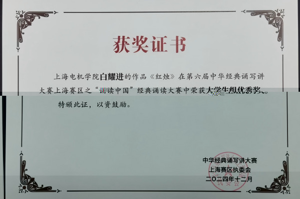 近日,教育部公布了第六屆中華經典誦寫講大賽結果,我校學子在“詩教中國”詩詞講解大賽中喜獲上海賽區留學生組三等獎1項,在“誦讀中國”經典誦讀大賽中喜獲上海賽區大學生組優秀獎1項。