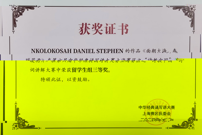 軟件2213班的國際學生NKOLOKOSAH DANIEL STEPHEN(中文名海洋),憑借對《面朝大海,春暖花開》的生動講解,榮獲“詩教中國”詩詞講解大賽留學生組三等獎。《面朝大海,春暖花開》是一首充滿希望與溫暖的詩歌,海洋同學深入挖掘作品内涵,用富有感染力的語言,将海子這首經典詩歌中的溫暖與希望傳遞給每一位觀衆。他的講解仿佛帶領大家走進了一個充滿詩意的世界,讓人們感受到了大海的廣闊與春天的美好。