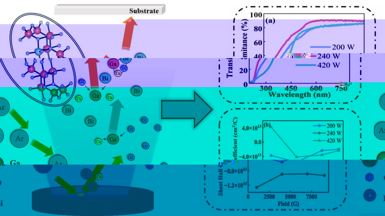 作為超寬禁帶半導體代表,β-Ga2O3憑借其優異的耐高壓、抗輻射特性及高紫外響應靈敏度,在電力電子與深紫外探測領域展現出巨大應用潛力。然而,受限于材料本征缺陷,其p型摻雜效率長期難以突破,成為制約器件性能提升的關鍵瓶頸。針對這一挑戰,研究團隊創新性地采用磁控濺射技術,在藍寶石襯底上制備了铋(Bi)、銅(Cu)共摻雜β-Ga2O3薄膜,并系統探究了濺射功率與退火工藝對材料性能的影響。通過多尺度表征技術,揭示了雙受主摻雜的協同作用機制:Bi的引入通過形成Bi2O3合金相顯著提升材料價帶頂位置,結合Cu摻雜對缺陷态的調控,成功調控薄膜光學帶隙。尤為關鍵的是,通過霍爾效應首次發現氧化稼的弱p型導電特性,該成果不僅驗證了雙受主摻雜對材料能帶結構的有效調控能力,更标志着p型β-Ga2O3摻雜研究邁出實質性一步。